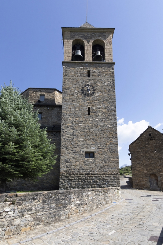 El campanario se sitúa en el muro de la Epístola, a un costado de la cabecera. Tiene planta rectangular y cuatro cuerpos (el inferior de los cuales corresponde a la sacristía). El cuerpo superior está separado de los restantes mediante una imposta; en sus paramentos se abren parejas de huecos en arco de medio punto para campanas. El remate es una cubierta piramidal, cuyos paños presentan doble pendiente.