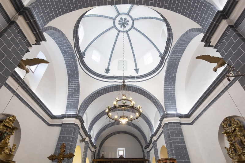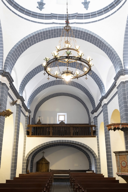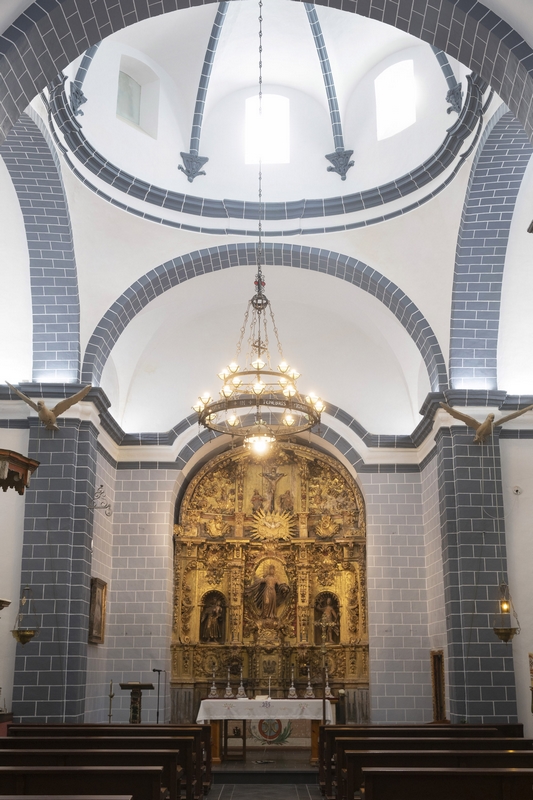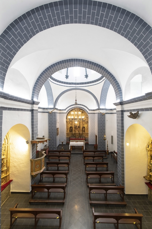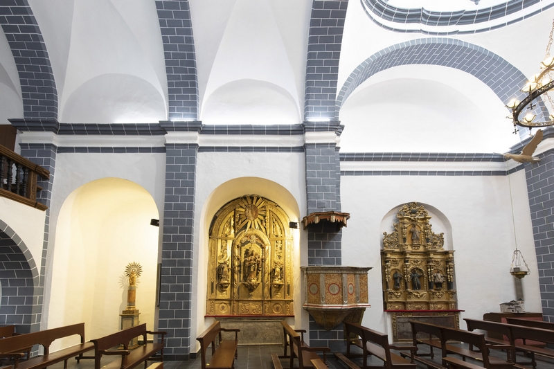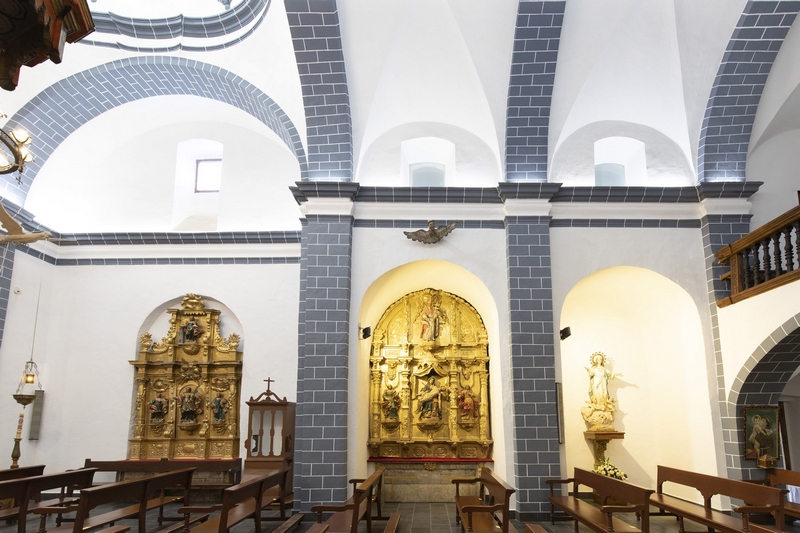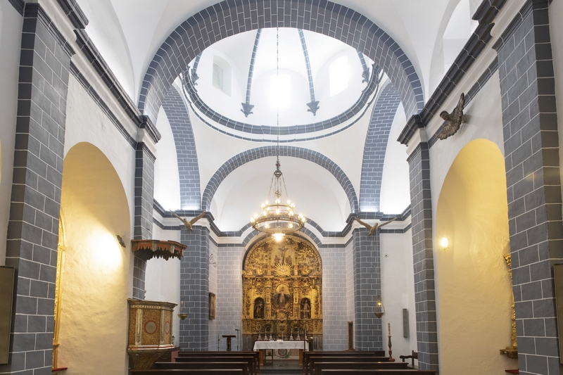 El interior está encalado y presenta decoración de estilo barroco. La única nave consta de tres tramos, cubiertos con bóvedas de cañón con lunetos; en el tramo de los pies se sitúa el coro alto, sobre arcos rebajados; en los dos siguientes se abren capillas laterales de escasa profundidad, con embocaduras en arco de medio punto. El crucero es de grandes proporciones respecto al conjunto del edificio y está cubierto con cúpula de ocho paños separados por nervaduras que confluyen en una gran clave central. La cabecera consta a su vez de dos tramos de distintas dimensiones, cubiertos ambos con bóvedas de cañón.