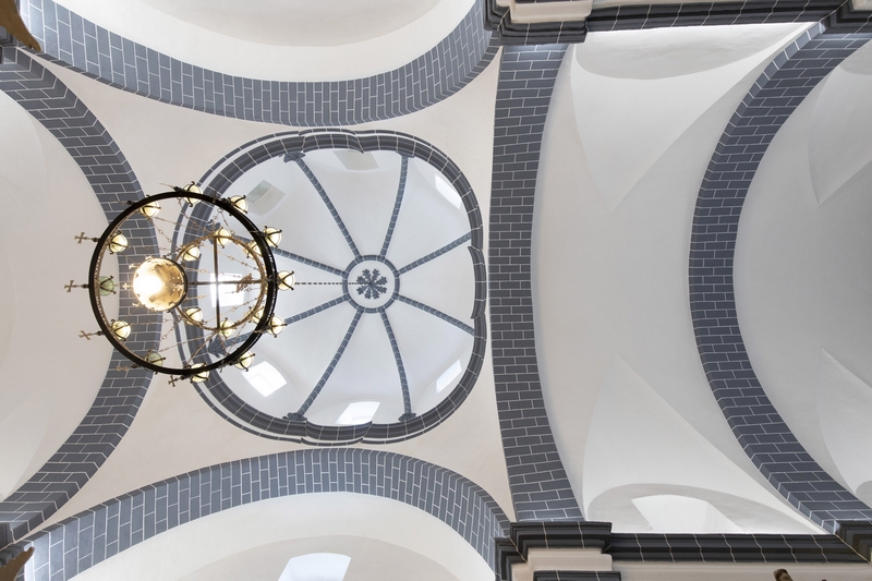 Al exterior destaca el escalonamiento de volúmenes originado por las distintas alturas de la nave y los volúmenes adosados, así como por el cimborrio octogonal de la cúpula que cierra el crucero, en cuyos paños se abrían sendas ventanas en arco rebajado que actualmente están cegadas. La iluminación de la iglesia se realiza mediante numerosos vanos, que en general son aspillerados en las zonas inferiores y de medio punto en la parte superior de los paramentos de la nave.