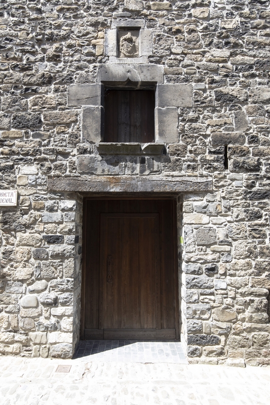 En el centro de la planta baja se abre una puerta adintelada con viga de madera, rehecha sobre un hueco de mayor tamaño, que sustituye a la original, que era en arco rebajado según Establés Elduque.