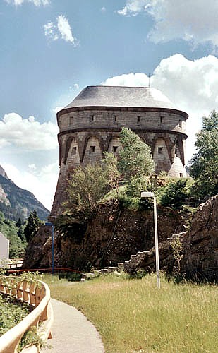 Pascual Madoz, señalaba que " la entrada desde Francia es más accesible desde esta parte, por la Cruz de San Port, que por el resto de Aragón, y añadimos que es la más peligrosa, porque a bondad del puerto, reune la circusntancia de ser la que mas directamente corresponde al camino carretero de Zaragoza, es la que dirige a Jaca, sin embargo a pesar de estas ventajas naturales, está bien defendida,hay un castillo viejo llamado de Candanchui y una venta de Santa Cristina, entre cuyos edificios se haya el puente de Escarne, cuyo paso puede ser impedido por aquellos edificios, está también el puente del río Seta entre la montaña de este nombre, el de Cochet entre Candanchui y Coll de Ladrones; cerca de Canfranc se encuentra otro paso engargantado por sierras de muy difícil rodeo llamado la Espelunca de Agulla, donde hubo una torre..."