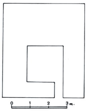 Elementos Interiores: Suelo de tierra y piedras, ligeramente inclinado hacia el fondo de la caseta. También hay maderos sobre piedras planas para sentarse, cuatro estacas de pino empotradas en los muros y la cubierta interior y de una de ellas cuelga un alambre de espino a modo de percha. Hay una botella de agua de plástico.