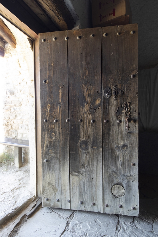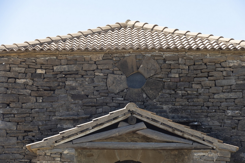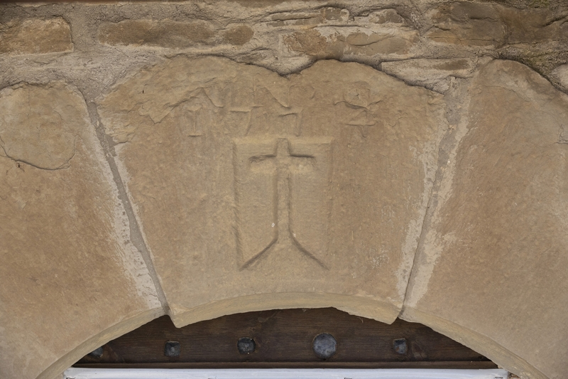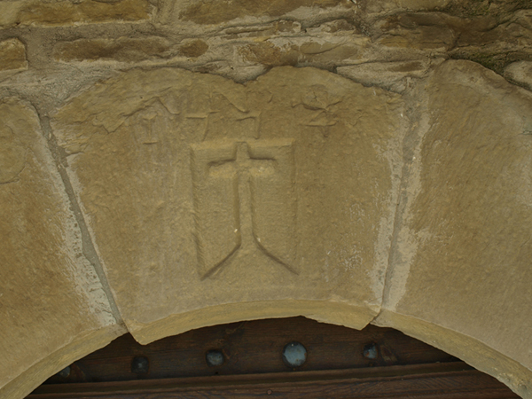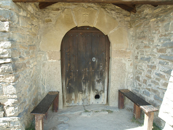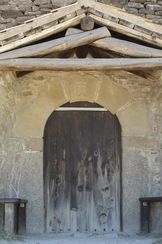 La puerta presenta arco de medio punto conformado por grandes dovelas y se protege mediante un porche de reducidas dimensiones cubierto por un tejado a dos aguas.