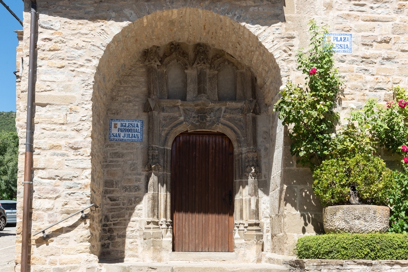 Del primitivo templo románico que en origen ocupó este solar, el único resto conservado es un arco de medio punto en la fachada de los pies, que perteneció a una antigua portada. La portada actual es gótica y está tallada con finura: se abre mediante un arco rebajado que lleva en la clave el escudo de los Sanz de Atarés, sostenido por dos ángeles, y va flanqueada por dos pilastras góticas. Se decora, en la parte alta, con dos arquillos conopiales rematados en pináculos. El conjunto da la impresión de haber sido reaprovechado de otro lugar y sus piezas vueltas a montar de un modo poco ortodoxo, posiblemente en época muy posterior. El pórtico poco profundo que la protege, en arco de medio punto, la corta por su parte superior.