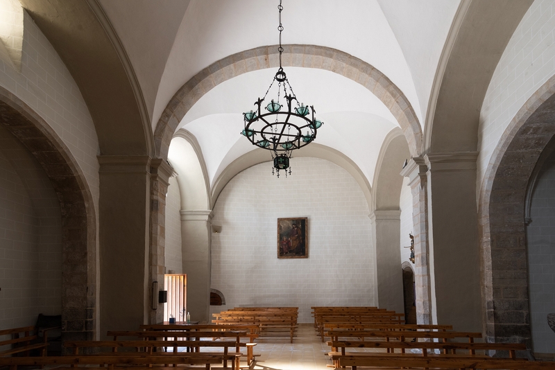 La nave, de tres tramos, se cubre en la parte de la cabecera con bóveda estrellada (en cuya clave figura de nuevo el escudo de los Sanz de Latrás), y con bóvedas de arista separadas por fajones en los dos tramos restantes. Los muros van enfoscados pero se ha dejado la piedra vista en la embocadura de las capillas. Tuvo coro en alto a los pies, eliminado en una restauración realizada en la segunda mitad del siglo XX. Conserva una pila bautismal del siglo XVIII, realizada por Francisco Lacosta, de Bernués.