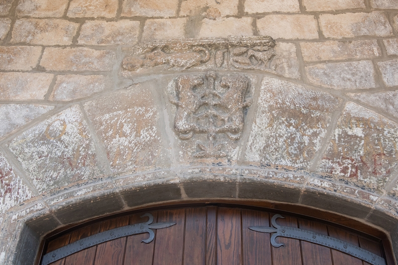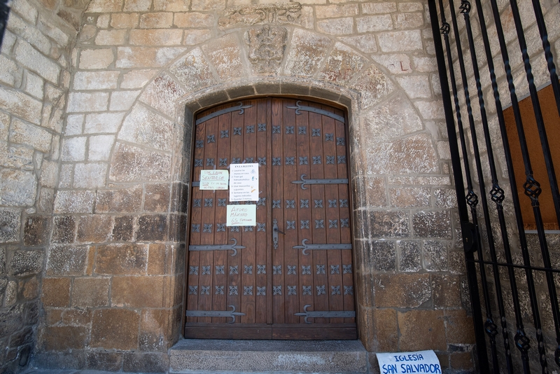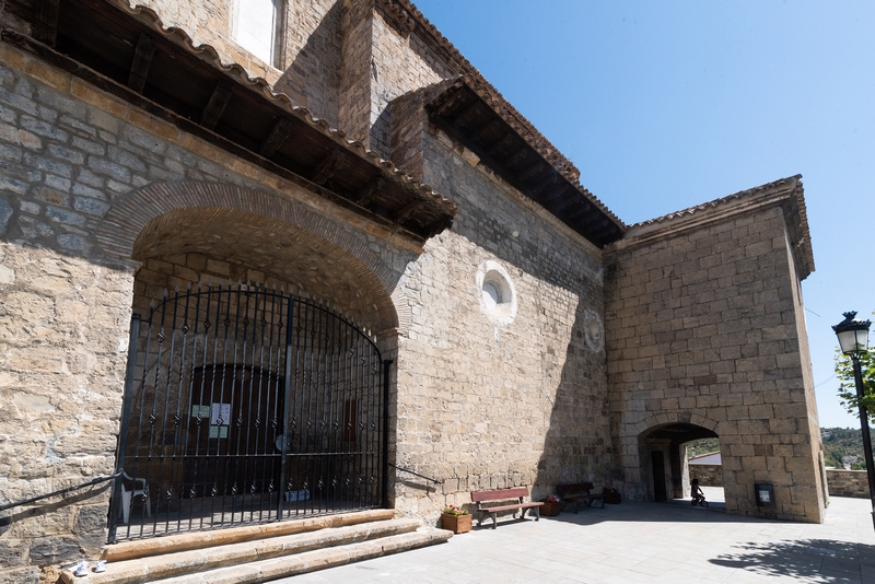 La portada se abre en el segundo tramo de la nave en el lado de la epístola, protegido por un pórtico con bóveda de cañón rebajado.