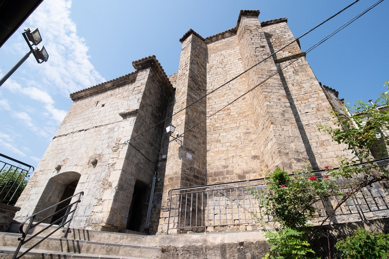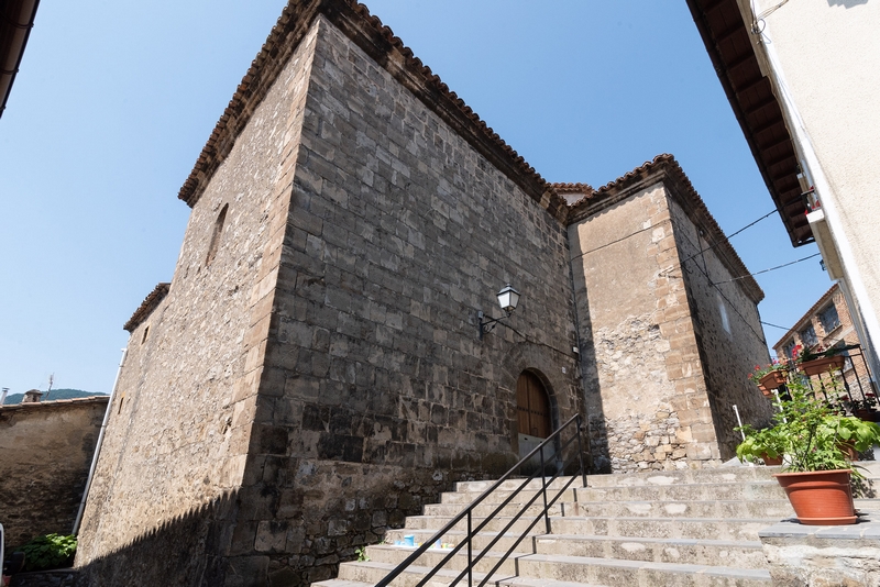 En el exterior destaca el volumen de la nave central con los contrafuertes, que emergen sobre capillas laterales, las ventanas de medio punto entre ellos, y el remate poligonal de la parte alta de la cabecera.