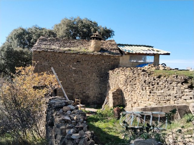 Sobre el tejado, por su lado noreste, asoma una chimenea de tipo tradicional, fabricada en piedra tosca, que parece erigida en una intervención más o menos reciente.
