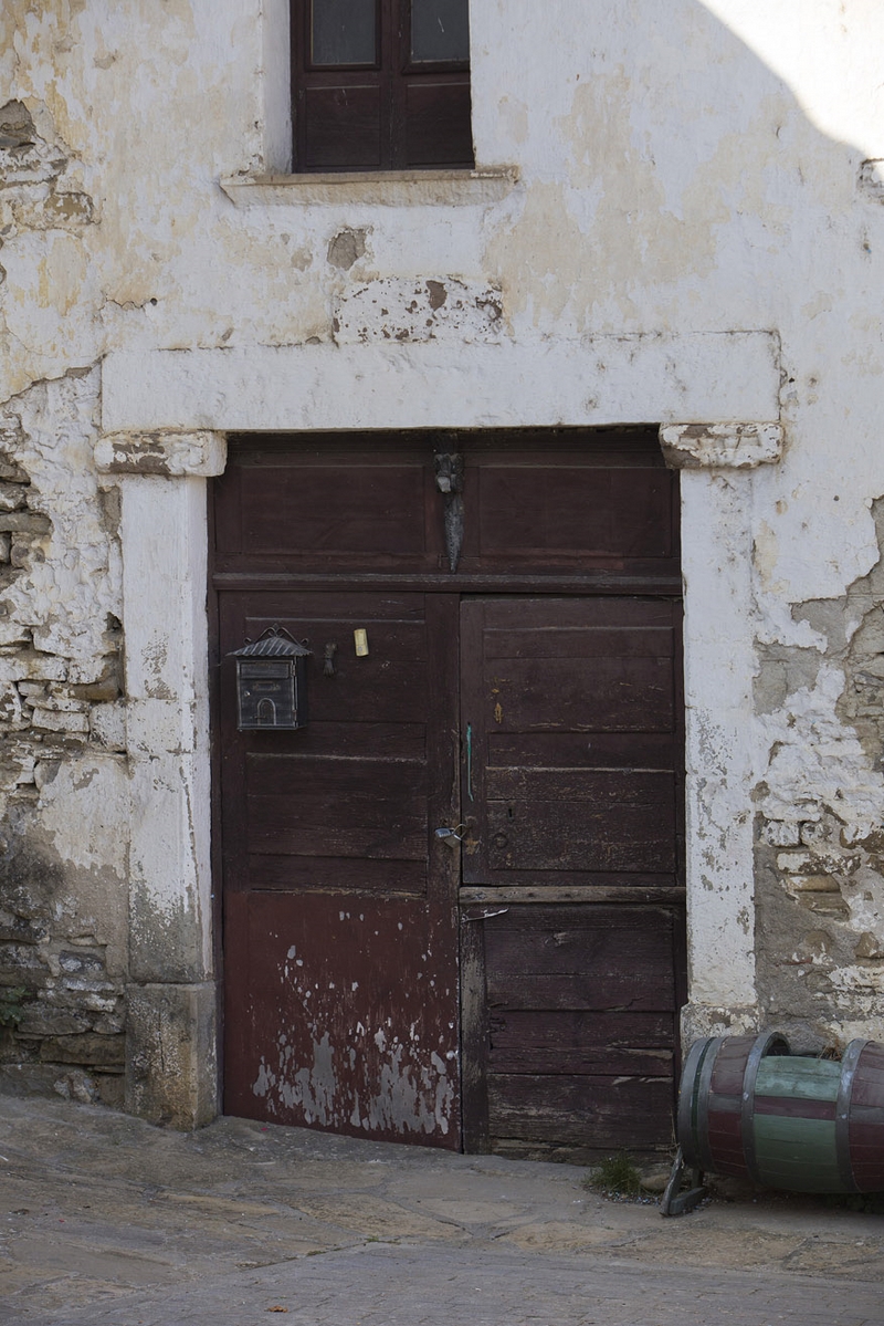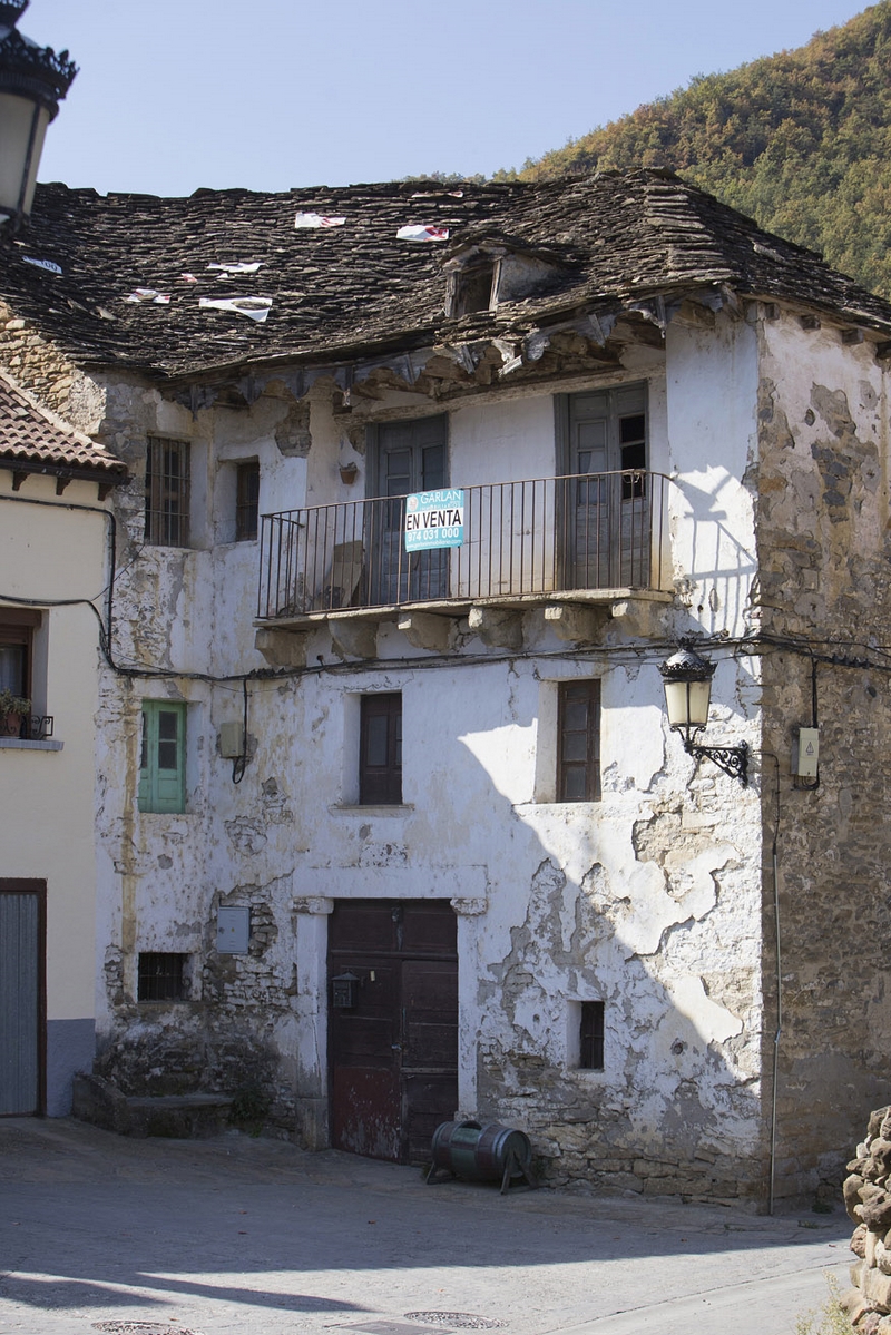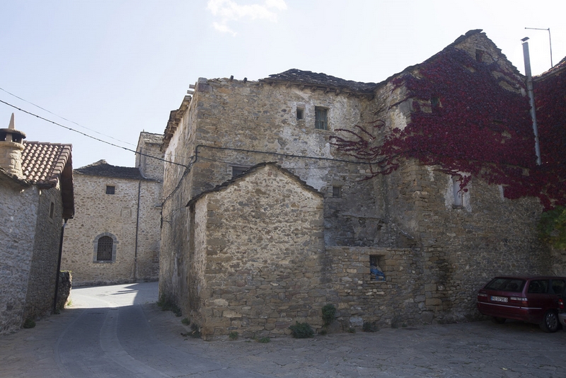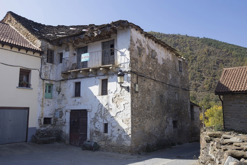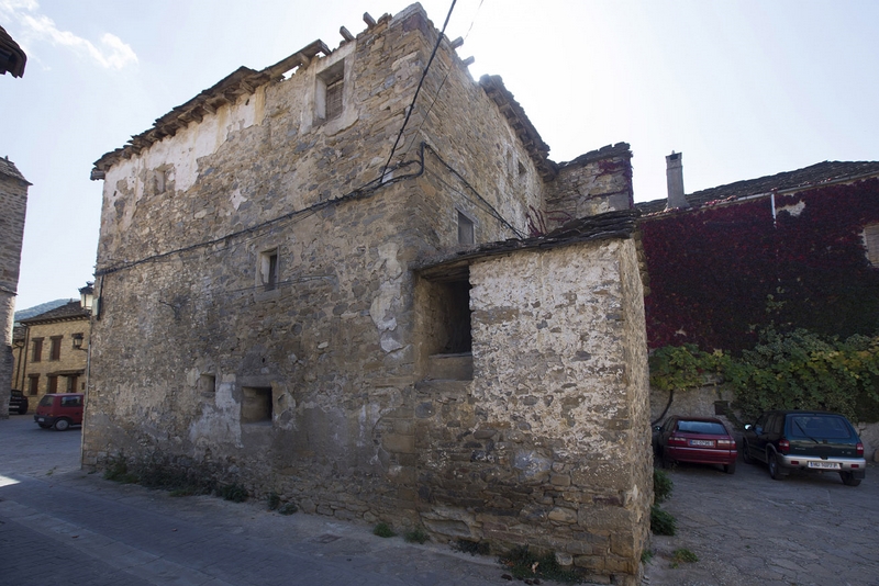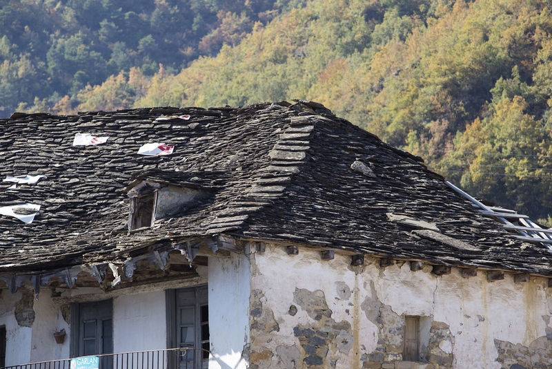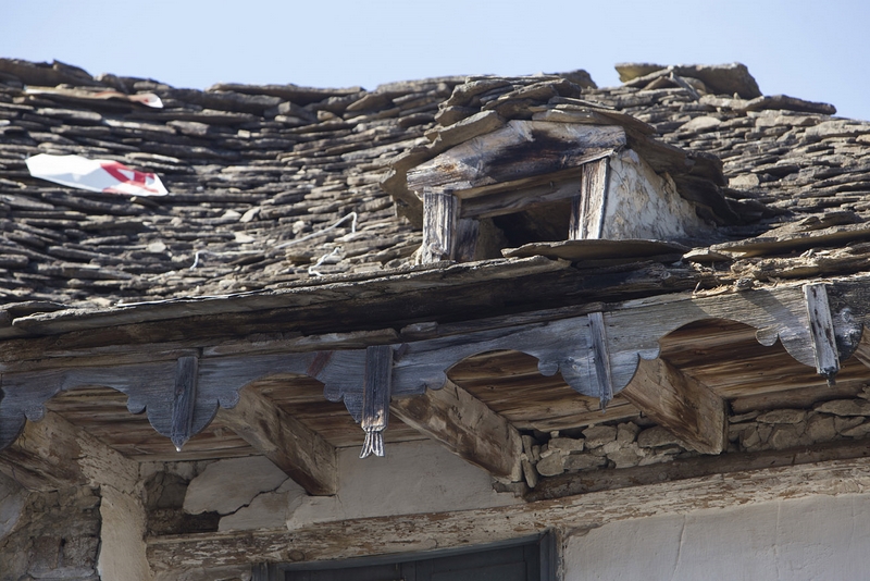 Posee tejado de losa de piedra sobre forjado de madera, a dos vertientes.Hay alero con decoración de madera recortada en la parte de la fachada.