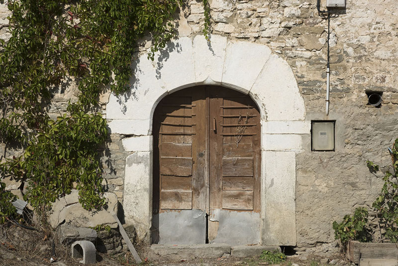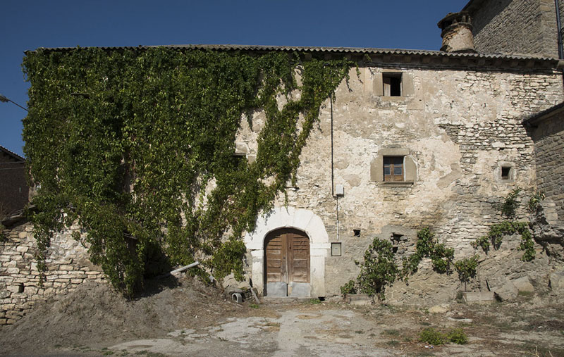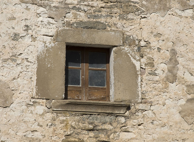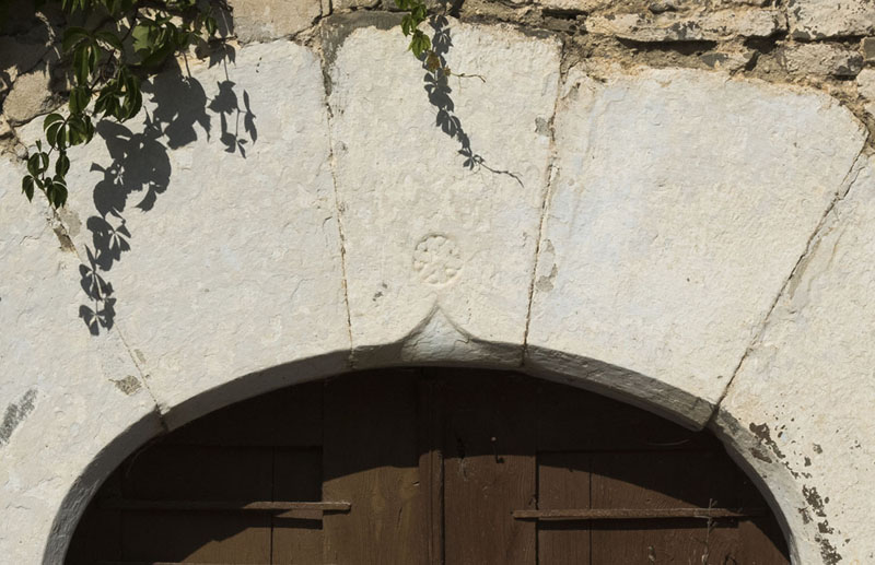 La fachada principal se ubica en el lado sur, con acceso con arco carpanel compuesto por tres dovelas centrales y dos grandes laterales que apean sobre pilares monolíticos. Se abren dos ventanas rectangulares de escasa altura en cada piso, con piezas monolíticas.