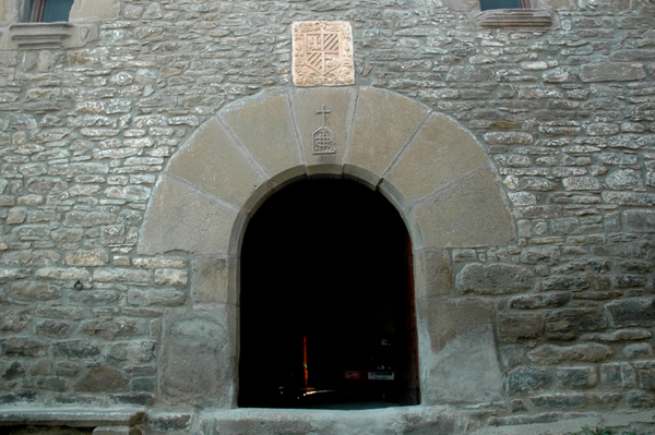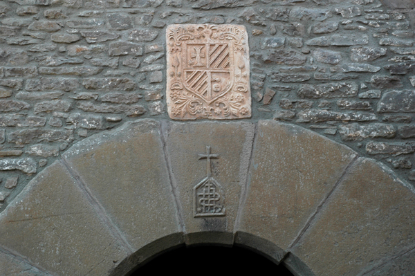 Sobre la clave, en la fachada, hay un escudo nobiliario, de talla bastante plana y esquemática sobre piedra de tono blanquecino. Su cuerpo es cuartelado y presenta, de izquierda a derecha y de arriba abajo, los siguientes motivos: cruz con estrella, barras oblicuas, barras oblicuas y cabeza surmontada por una mano. Tiene timbre de hidalguía y está rodeado por lambrequines de carácter vegetal.