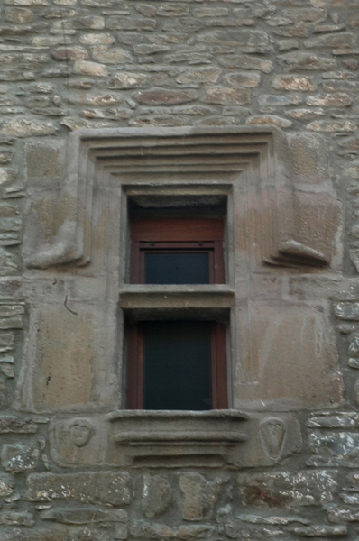 Las dos ventanas del piso principal tienen también interés, especialmente la situada en el lado izquierdo. El vano presenta un parteluz horizontal y está rematado por un dintel muy ancho con una sucesión escalonada de molduras ligeramente cóncavas; también las jambas presentan una moldura en bocel similar a las anteriores, y el alféizar es volado y moldurado, y está flanqueado por dos pequeñas cabezas en relieve de talla muy tosca y esquemática. La otra ventana de esta planta, de menor tamaño y también adintelada, presenta también un marco molurado y alféizar volado, aunque considerablemente más sencillos que en el caso anterior.