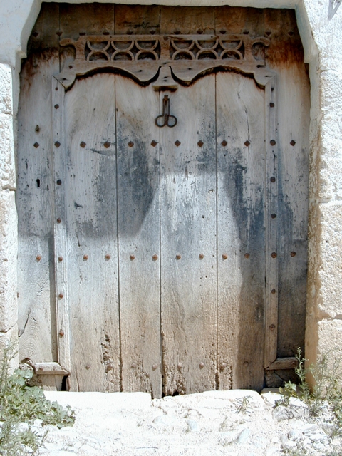 Tiene dintel monolítico, que apea sobre jambas de sillares, uno de los cuales está tallado con perfil mixitílineo. Destaca la carpintería de la puerta, a la que se superpone un elemento de madera con decoración geométrica de medios círculos de los que pende una campana también de madera. Tirador de tipo fálico.