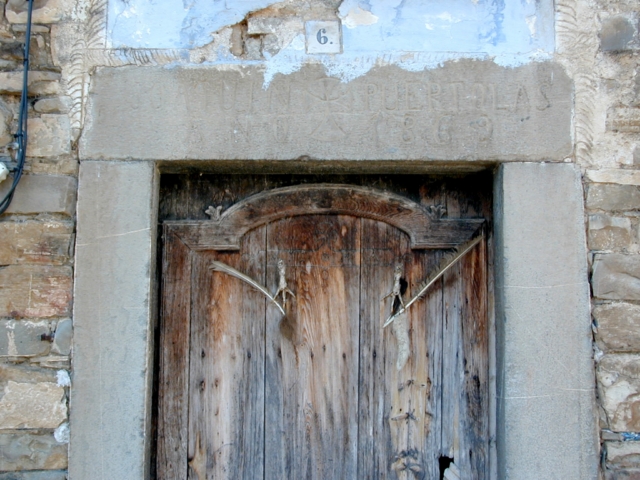 La portada se encuentra en la parte central de la fachada. Es adintelada con un ancho bloque monolítico bien trabajado, en cuyo frente hay grabada una cruz de tipo más o menos patado y, a ambos lados de la misma, la inscripción: "JOAQUIN PUERTOLAS / AÑO 1869". Apea sobre jambas configuradas por enormes bloques de piedra tallada dispuestos verticalmente a lo largo de toda la altura del vano.