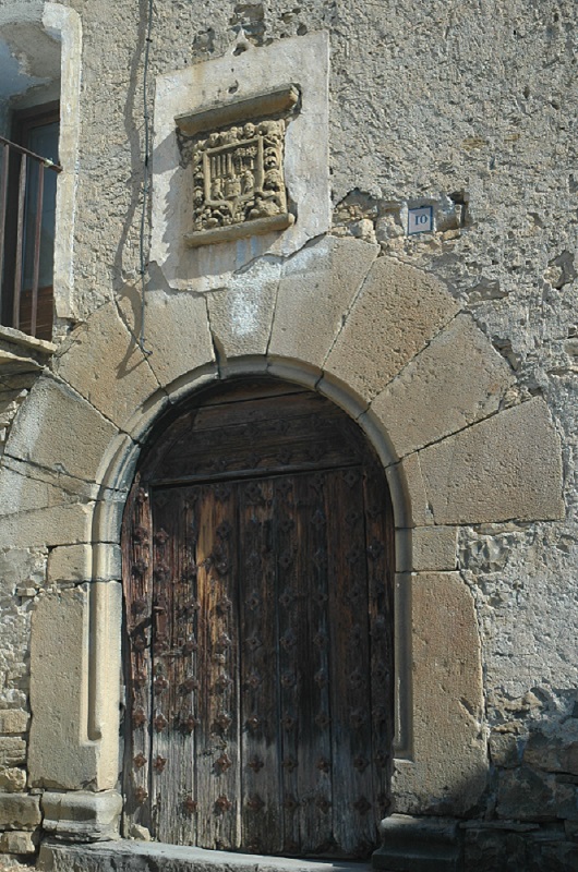 La puerta principal es uno de los pocos elementos visibles al exterior que datan del siglo XVI. Es un gran vano en arco de medio de largas dovelas, dispuestas simétricamente en torno a una clave más estrecha, con la arista moldurada. Apea sobre jambas monolíticas rematadas en salmeres cúbicos, que arrancan de basamentos moldurados.