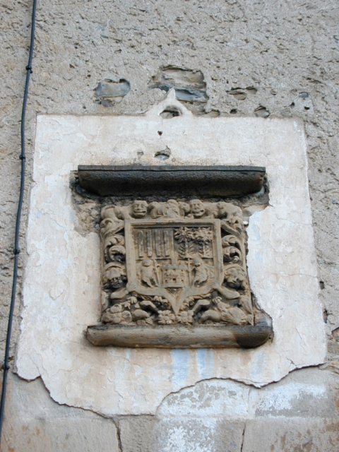 Sobre la puerta principal hay un escudo, que puede datar de principios del siglo XIX por sus características. Está enmarcado por dos molduras de piedra en su parte superior e inferior y por relieves figurados (angelotes, cuadrúpedos, motivos florales) a modo de lambrequines. El cuerpo del escudo está dividido en tres cuarteles. En los superiores, bandas verticales en el primero y dos elementos vegetales en el segundo; en el inferior, castillo flanqueado por dos personajes con picas.