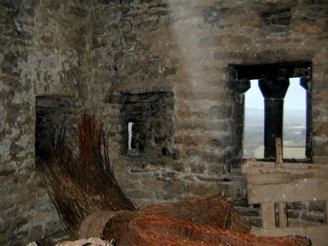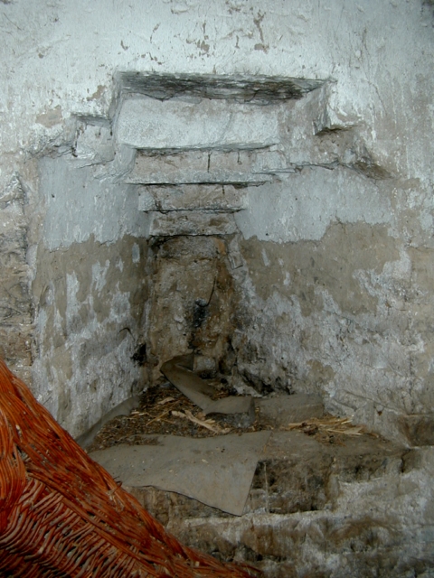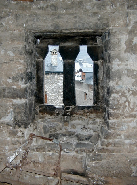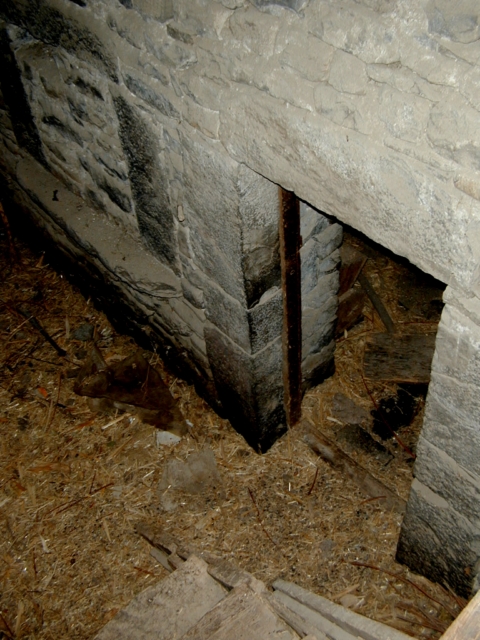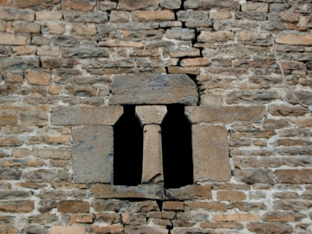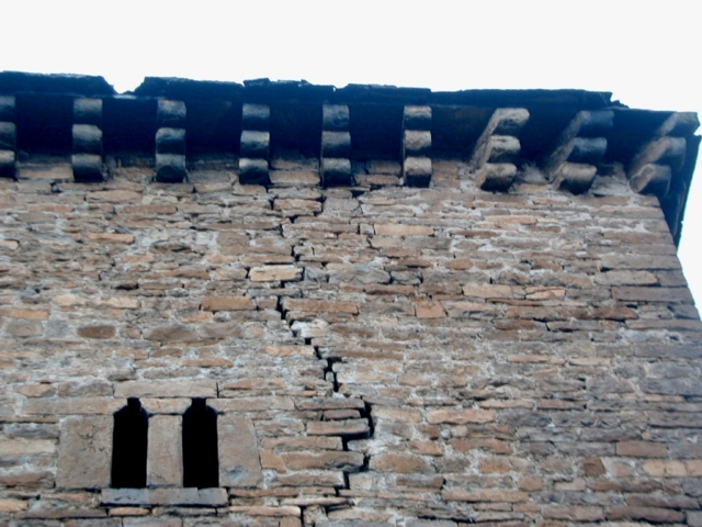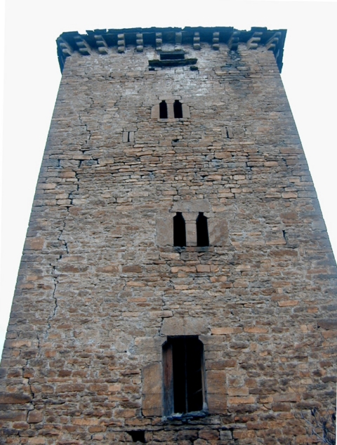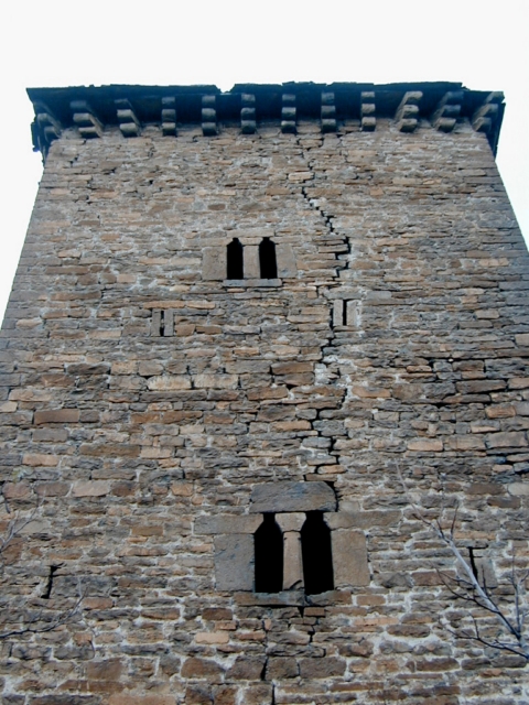 La planta superior presenta un único vano, adintelado y con una repisa a la altura del alféizar. Dada su situación en el eje de la puerta original de acceso, la repisa puede haber formado parte de un matacán defensivo.