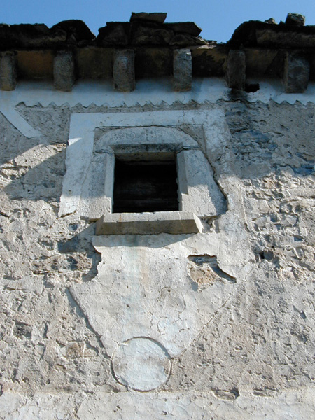 Las fachadas se encuentra totalmente cubierta con una gruesa capa de revoque de cal y arena, con motivos decorativos superpuestos en cal sobre el revoque: banda separando los pisos, hilera de zig zag bajo el alero y recuadramiento de los vanos con banda circundante terminada en una gran superficie triangular por su parte inferior. Un elemento único es la decoración figurativa en uno de los canetes sobre esta ventana, con posibles fines protectores.