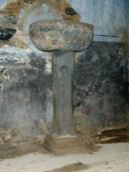 Pila benditera exenta, de copa elíptica decorada con medios rombos en el borde; fuste paralelepipédico biselado, con un corazón coronado por una cruz, la fecha de 1775 y una flor labrados en el frente.