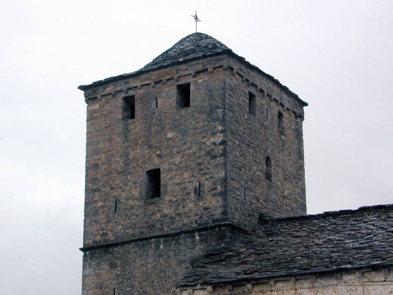 La torre es de mampostería, de planta cuadrada y montada sobre la cabecera. Consta de dos cuerpos separados por una imposta en filete y cierra con armadura de madera a cuatro vertientes. Bajo la cornisa hay un friso de canecillos en los cuatros muros que sostienen una imposta.