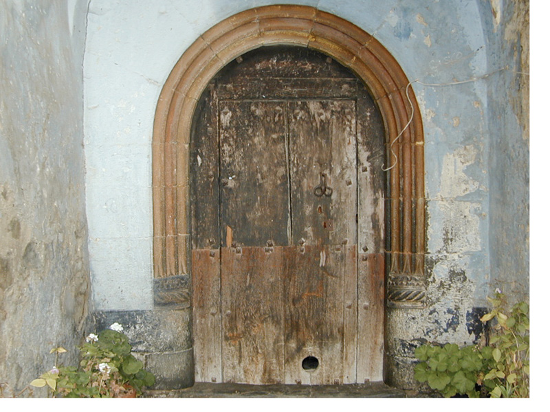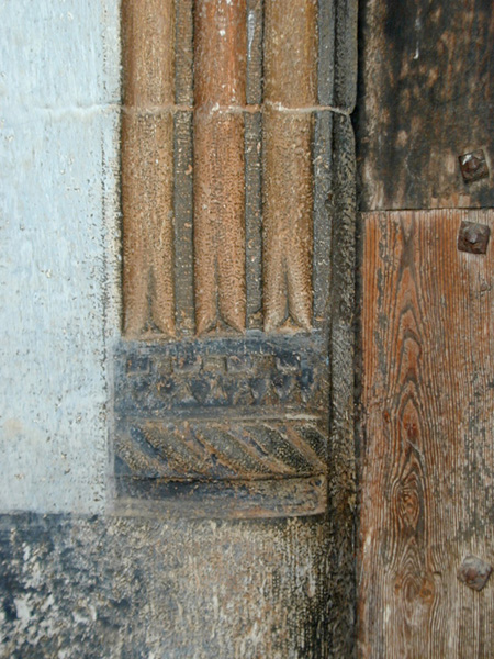 La puerta se abre al sur en arco de medio punto con tres molduras cóncavas, protegida por un pórtico cubierto con bóveda de lunetos.