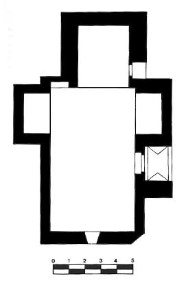 Es una obra de mampostería con abundante argamasa, de nave rectangular con cabecera recta y más estrecha, orientada al este, y dos capillas muy pequeñas a modo de un crucero bajo.