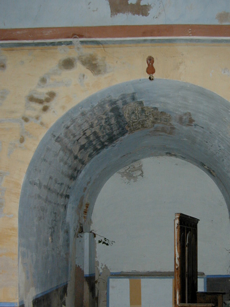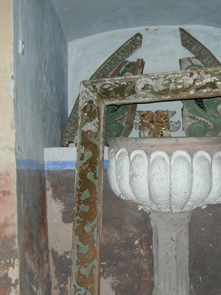 El acceso se emplaza en los pies de la iglesia, bajo arco de medio punto.