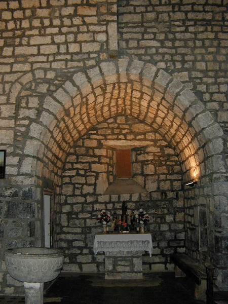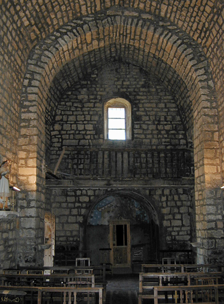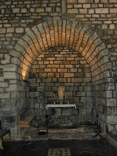 Tiene coro alto a los pies, bajo el cual, en el muro de cierre, se abre una hornacina en arco de medio punto.