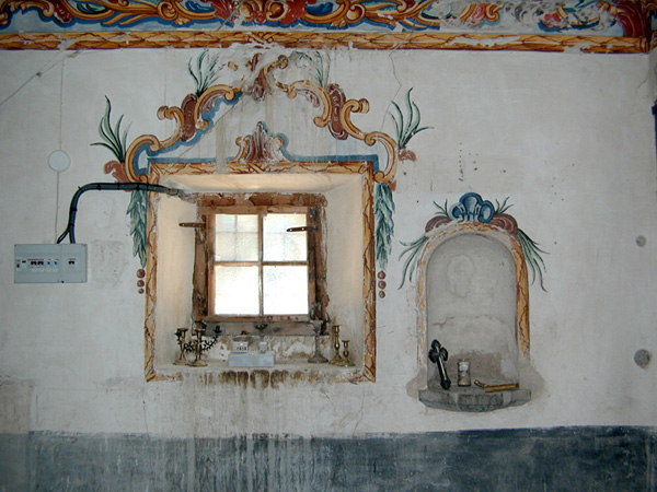 Posible decoración de los muros interiores con el repertorio habitual en Sobrarbe en esta época (espejos, florones...), de la que solo queda testimonio en la sacristía.