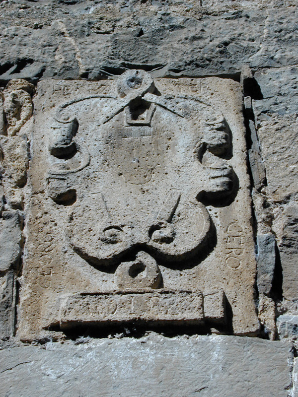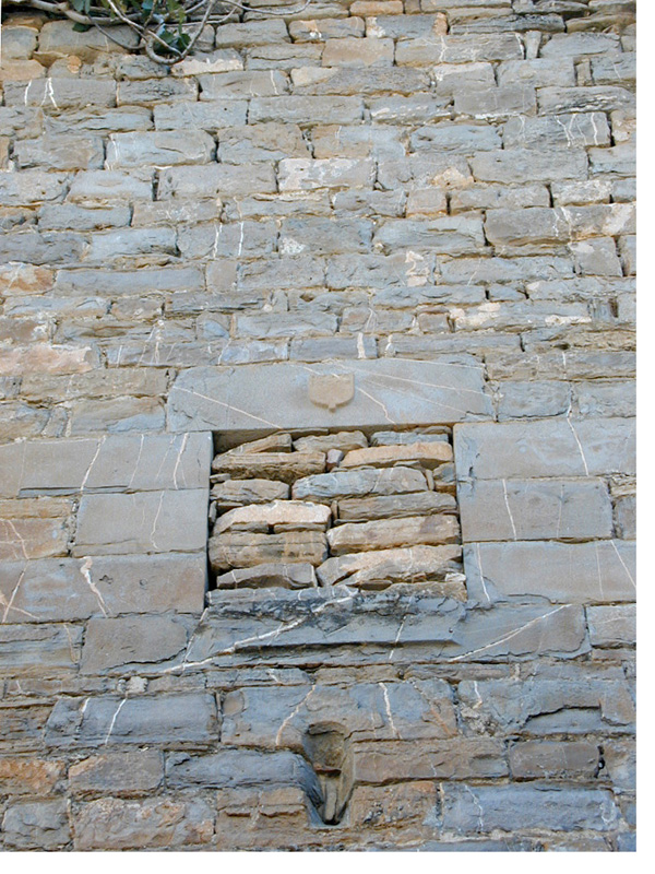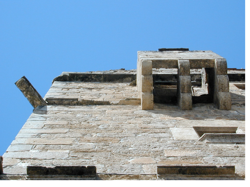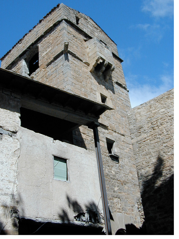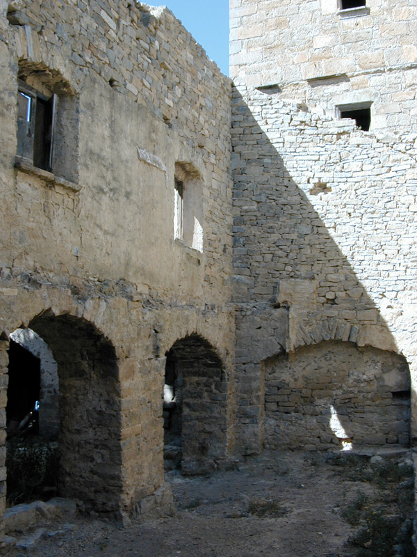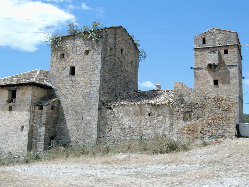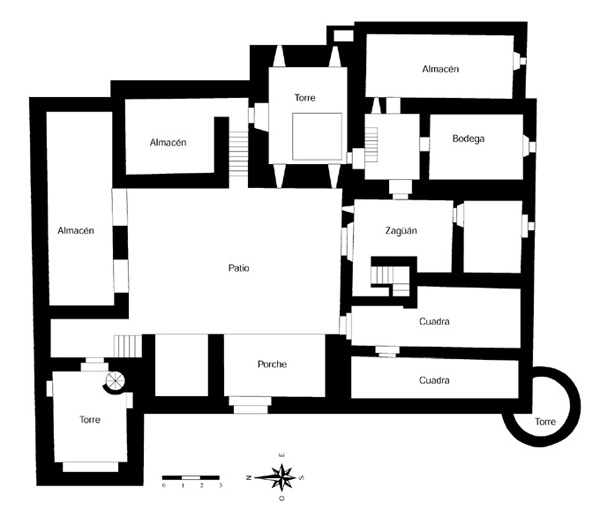 En la diagonal noroeste-sudeste se levantan dos torres de planta cuadrada de gran envergadura, y una tercera circular en la esquina sudoeste; unidas entre sí por los bloques de la vivienda de planta baja y un piso.