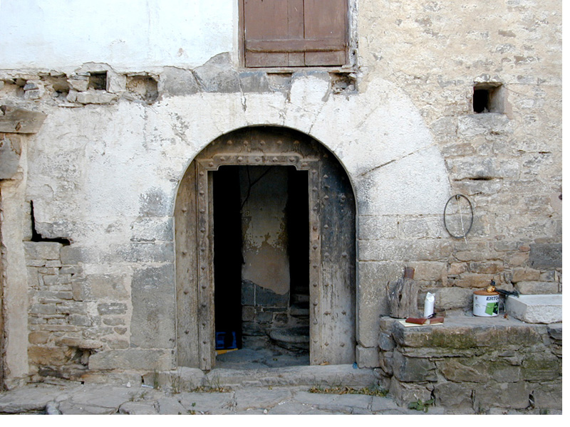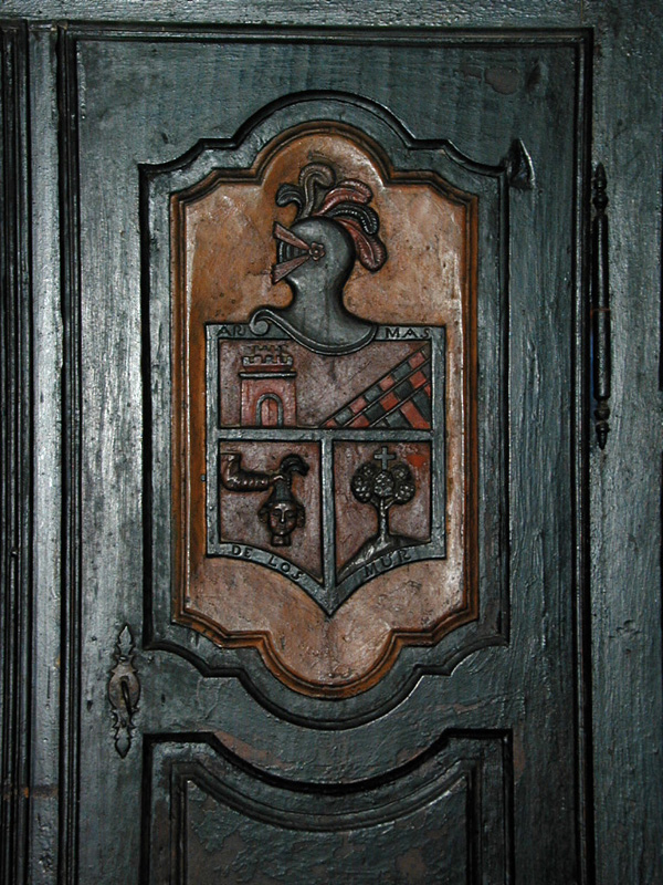 A la vivienda, como se ha dicho, se accede desde el patio a través de una portada de arco de medio punto formada por grandes dovelas, dando paso a un pequeño patio que conserva el enmorrillado original. En el patio se observa una puerta adintelada donde se conserva el escudo de los Pérez formado por un triángulo de tres peras en relieve, la puerta da paso al “estudio”, lugar donde se custodiaban las escrituras, titularidades y privilegios de la familia. Este espacio presenta un armario empotrado y una ventana de bancos transversales al muro, con molduras y una rejería al exterior típica del siglo XVI-XVII.