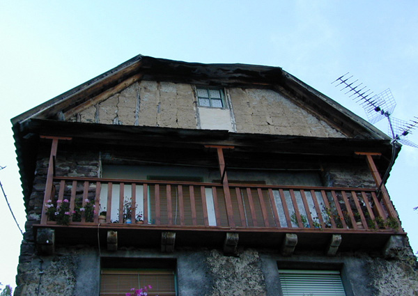 Como en estos casos, la segunda planta abre también en galería con balaustrada de madera bajo jácena sostenida por tres pies derechos del mismo material, aunque en este caso la galería se abre a lo largo de toda la longitud de la fachada. También, igualmente, el hueco de la falsa cierra mediante tabique de listones cuyo espacio intermedio ha sido relleno mediante cal y arena, que en este caso parece haber sido encofrada. Todo ello protegido por el característico faldón triangular en el extremo del tejado.