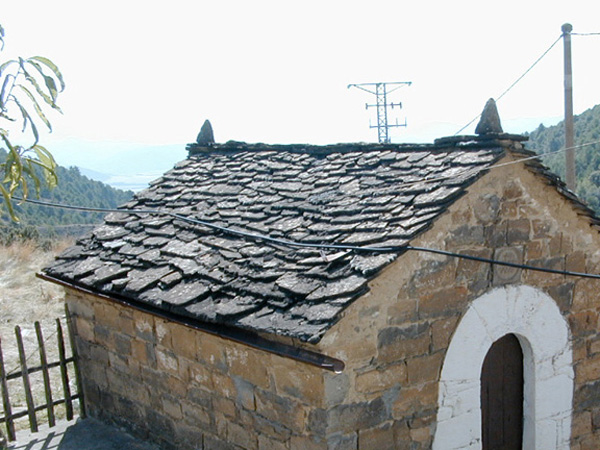 El tejado es a dos aguas y se cubre con losas de piedra. Remata en dos pináculos de una pieza. El saliente del muro sur se cubre con una prolongación del tejado y en el mismo material.