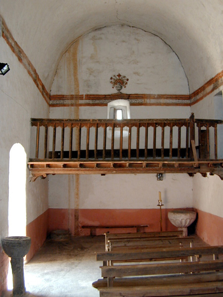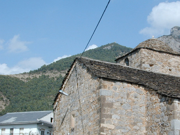 Es un edificio construido con mampostería y sillar en las esquinas, con cubierta de losa a dos aguas. Está orientado al E. El acceso está precedido por un pórtico cubierto con bóveda de cañón, en cuyos muros se adosa un banco corrido de piedra. La puerta es en sencillo arco de medio punto de grandes dovelas, cuyas esquinas van molduradas en forma cóncava. Sobre él hay un forntón trinagular, con una bola en cada esquina y en el centro del tímpano, labrada, la fecha: "AÑO 1602". Tiene planta de cruz latina, con la cabecera mucho más baja, cubriéndose todos nave, capillas y cabecera con bóvedas de medio cañón. La capilla del lado S ha sido reconvertida en sacristía, habiendo sido cerrada por un muro con puerta adintelada. La nave y cabecera presentan decoración pictórica mural: una banda ocre a modo de imposta, imitando molduras rellenas de decoración geométrica, recorre la nave a la altura de la bóveda; el arco triunfal presenta una decoración de cortinajes, rocallas y aves, con tornapuntas en el intradós; la bóveda del ábside muestra la continuación de la imposta fingida, de la que parten dos lunetos pintados (en uno de los cuales hay un tarjetón con la fecha: 1805), rodeados por decoración vegetal de carácter popular. Es un tipo de pintura muy habitual en las iglesias de Sobrarbe, realizada a partir del siglo XVIII.. En el muro de la cabecera quedan restos de pintura imitando sillares de piedra, según era habitual en la época de construcción de la iglesia. El elemento más destacado del edificio es el coro alto, situado a los pies, al que se accede por escalera intramural desde la capilla N del crucero. Va montado sobre dos jácenas, sobre las que se sitúan transversalmente las 13 vigas, que terminan en cabezas muy esquemáticas pintadas con dientes de sierra blancos y negros. Las jácenas llevan labrados motivos de estrellas y ondas. El antepecho es de madera, con los barrotes unidos formando pequeños arcos conopiales. La torre se sitúa se sitúa sobre el brazo N del crucero. Es de un solo cuerpo. El acceso se realiza por el exterior, en alto, en el muro E. No puede accederse en la actualidad, aunque según descripciones anteriores tiene dos pisos al interior, el inferior cubierto con bóveda de cañón longitudinal al eje de la iglesia, y el cuerpo de campanas con casquete octogonal sobre cuatro trompas. Tiene tres vanos de medio punto para campanas en los lados N, E y O. Destaca una de las campanas, con un cruz de forja en su parte superior.