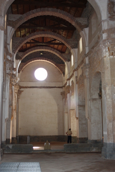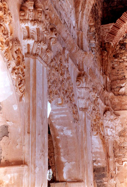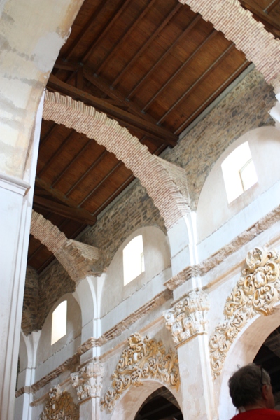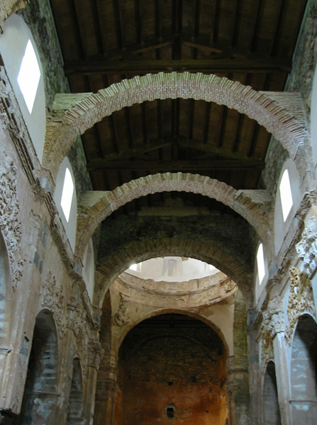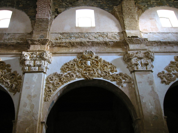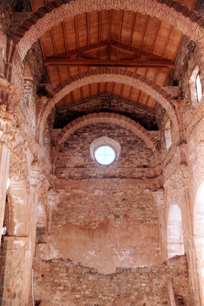 La nave central, más alta que las demás, se cubría con bóveda encamonada de lunetos, y las laterales, con bóveda de cañón apuntado.