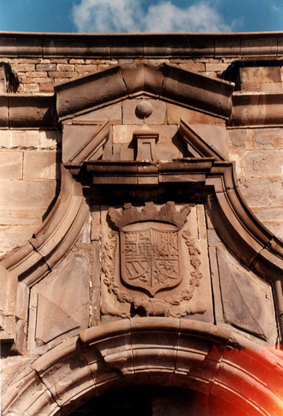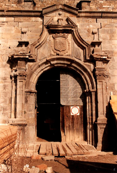 Se trata de una puerta en arco de medio punto, labrada con dos pilastras y frontón mixtilíneo rematado en tres pináculos con bolas, y en el tímpano escudo real con corona y toisón, pertenenciente a los monarcas Felipe V e Isabel de Farnesio.
