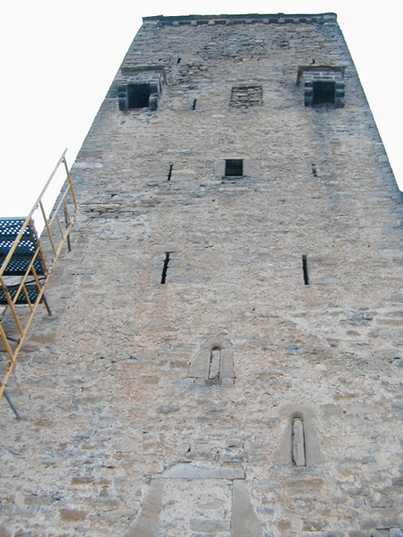 El muro este presenta en todos los pisos un par de aperturas aspilleradas. Pero lo más llamativo es la presencia de matacanes sobre dos ménsulas escalonadas; hay uno en el costado oeste, junto a la esquina meridional, y dos en el este. Encontramos un cuarto en uno de los últimos pisos de la abadía.