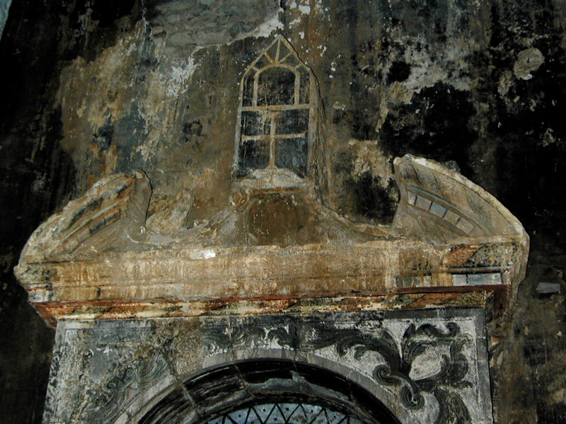 Presenta el interior enlucido y pintado en grisalla, centrándose la presencia de motivos decorativos en la cabecera principal (cortinajes, pilastras y otras simulaciones arquitectónicas) y en el arcosolio, insistiendo en los temas arquitectónicos y con elementos vegetales en las enjutas del arco.