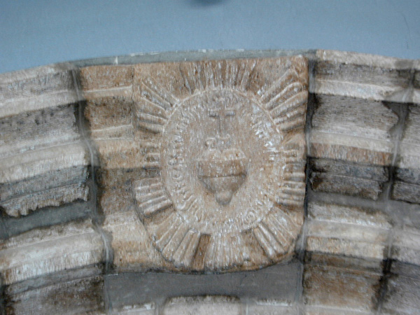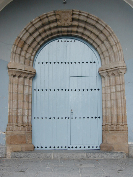 La puerta se sitúa en el lado sur, en el tramo inmediato a los pies. Está precedida de un pórtico rectangular, abierto al exterior por el frente en un arco de medio punto y cubierto con cúpula deprimida de ocho paños. La puerta es en arco de medio punto, con cuatro arquivoltas de cortes muy vivos y relieve en la clave representando un corazón coronado por una cruz y rodeado de haces de rayos.