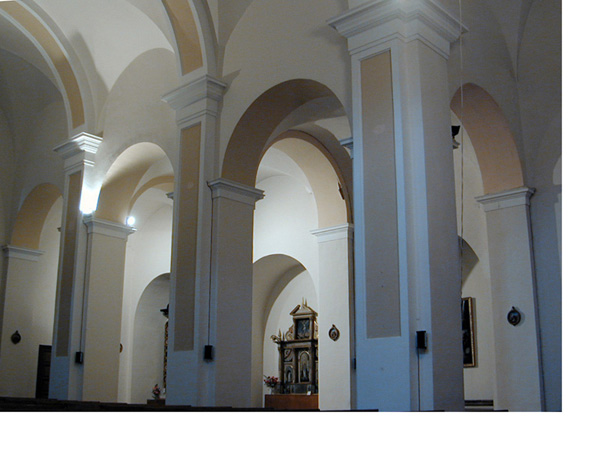 Al interior la iglesia consta de tres naves, separadas por pilares cruciformes en los que apean los formeros de medio punto y con tres capillas laterales en el costado norte y dos en el sur. Las tres naves están a su vez divididas en tres tramos por fajones de medio punto, cubriendo cada uno de los tramos con bóvedas de cañón con lunetos (que en las naves laterales, al cubrir espacios cuadrados, dan la impresión de ser de arista).
