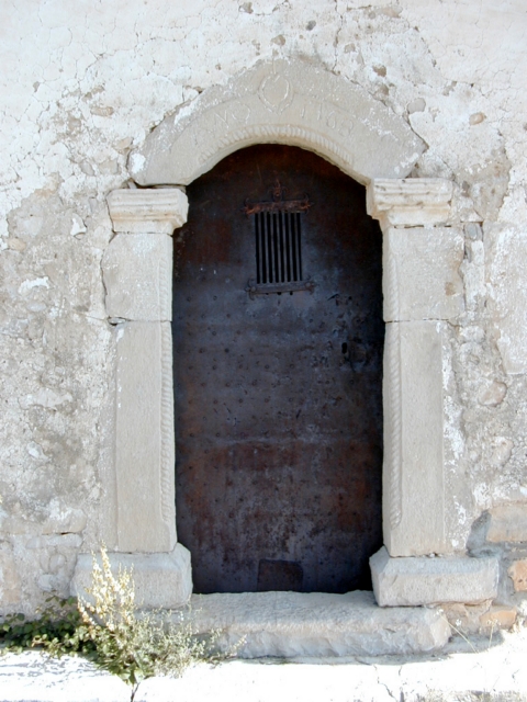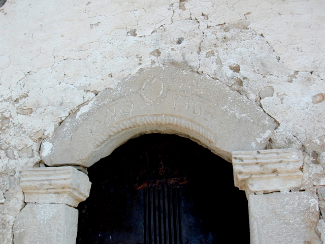 La puerta se encuentra a los pies y es quizá el elemento más interesante. Se abre en arco rebajado monolítico sobre impostas molduradas. La arista del arco está decorada con sogueado y, sobre ella, hay un relieve con un corazón cimado por una cruz y la fecha AÑO 1768. La arista de las jambas, que son en dos piezas, va también moldurada con sogueado.