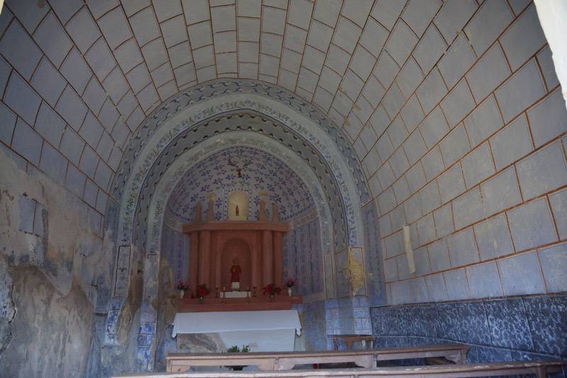 El interior es un espacio unitario, cubierto con bóveda de medio cañón en la nave, bóveda de cañón ligeramente apuntada en el breve presbiterio y bóveda de horno en la cabecera. Muros y cubierta están decorados con pinturas que imitan sillares y motivos ornamentales de carácter arquitectónico.