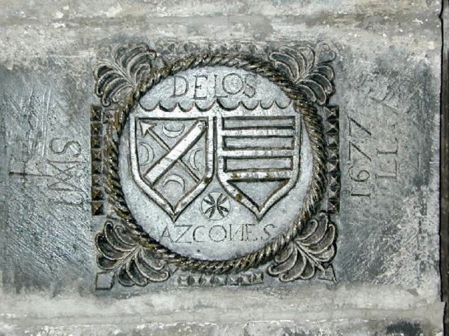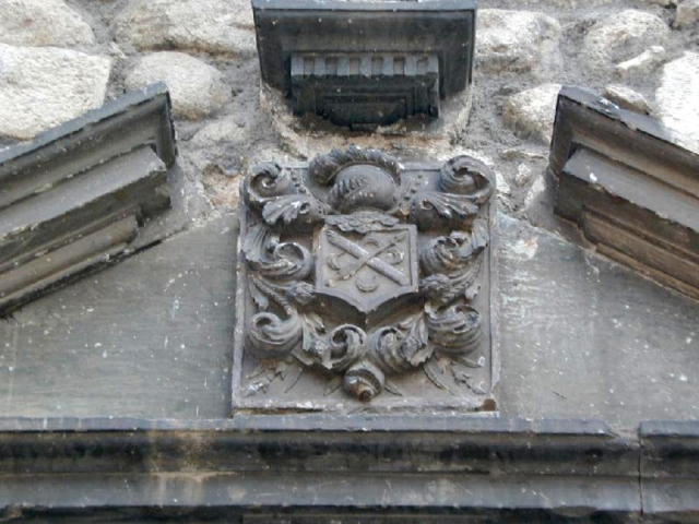 Escudo a banda con flecha a barra. Remate con timbre de hidalguía y lambrequines de acantos.