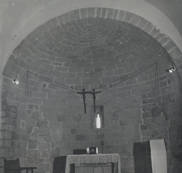 Al interior el edificio consta de una nave, con cabecera semicircular orientada al este, y dos capillas en cada lado. La nave está dividida en dos tramos, uno de los cuales se cubre con bóveda de cañón y otra con bóveda de cañón apuntado, la cabecera con cuarto de esfera y presenta en su parte central una ventana abocinada de doble derrame, y las capillas con medio cañón, salvo la primera del lado del evangelio, que lo hace con cúpula hemiesférica sobre pechinas con decoración floral en yeso y estando rematada por una linterna. Las embocaduras de las capillas, todas ellas en arco de medio punto, varían en cuanto a su altura, siendo superior la de las dos más próximas a la cabecera.