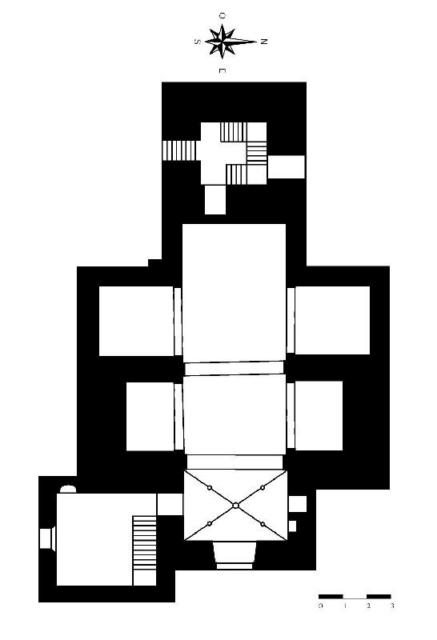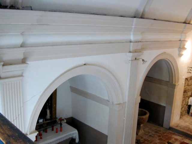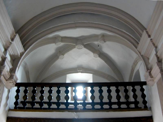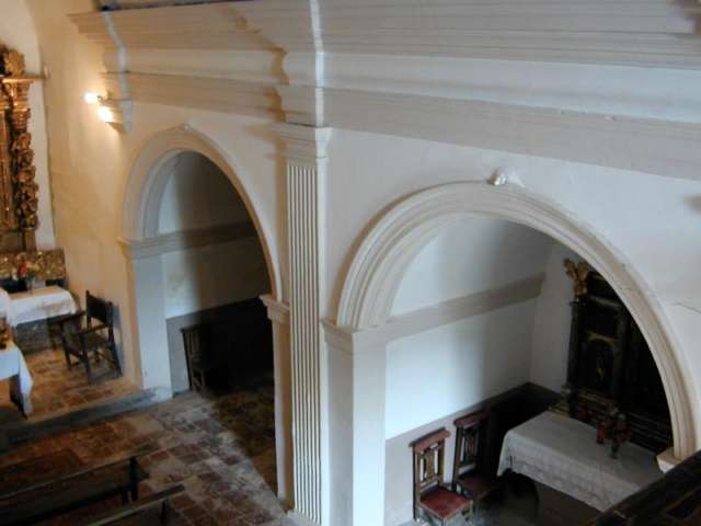 A los pies, en el lado del evangelio, hay una estancia cuadrangular, con acceso por puerta adintelada y cubierta con cielorraso, de la que arranca las escaleras de acceso al coro.