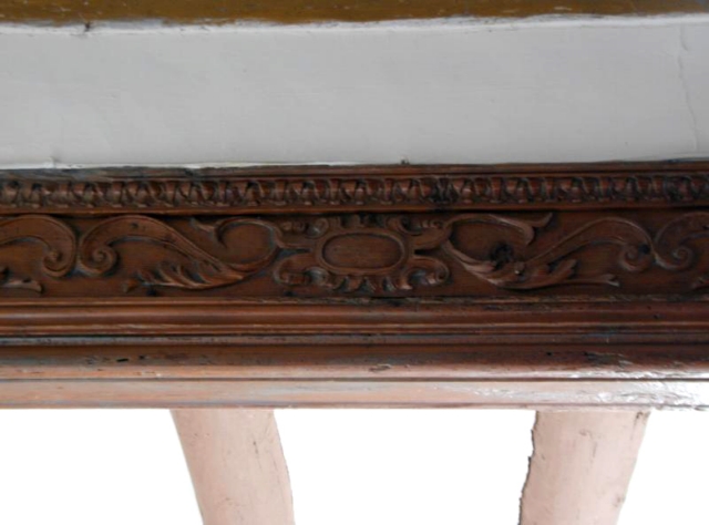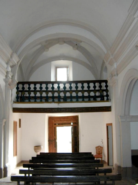 El coro, alto, se sitúa a los pies, sobre cubierta plana. Tiene balaustrada de madera tallada y jácena con relieves vegetales.