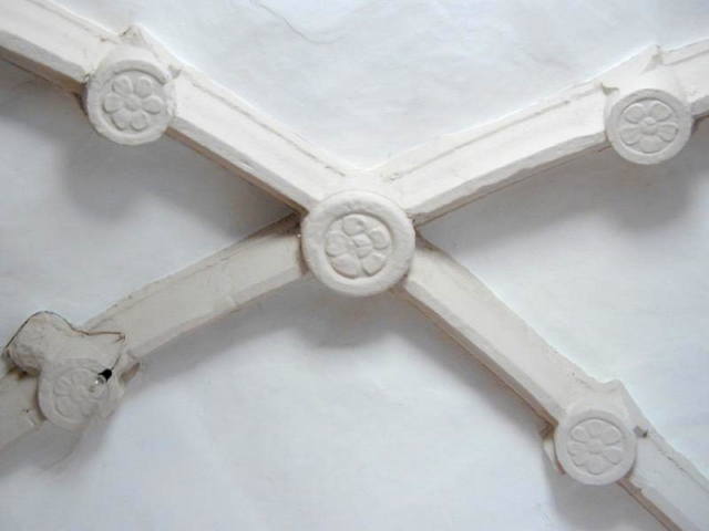 Al interior, la nave se divide en tres tramos, separados por fajones que apean en pilastras acanaladas. Se cubre con bóveda de cañón, que arranca de doble entablamento de escayola moldurada, salvo el tramo de los pies, que está cubierto con bóveda de crucería con clave central y dos claves secundarias en cada nervio decoradas con flores incisas.