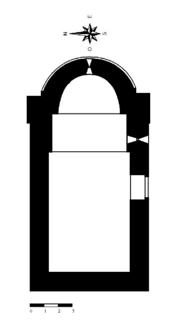 Es una iglesia de una nave, con un presbiterio muy acusado por un estrechamiento de la planta y cabecera semicircular orientada 90 grados este. Está realizada con sillares de buena labra y generalmente gran tamaño, dispuestos en hiladas regulares de altura variable, componiendo un muro de gran grosor mediante relleno de ripio que separa las capas de sillares interior y exterior.