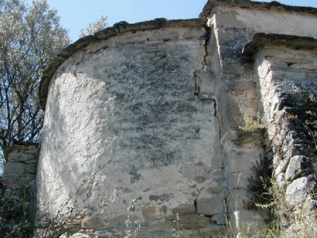 Edificio que sigue la tipología románica habitual, con una sola nave y cabecera curva (semicírculo ligeramente peraltado) orientada al E. Está elevado en mampostería, con refuerzo de sillar en las esquinas, totalmente revocada con mortero de cal que aún se conserva en el exterior de la cabecera y algunos puntos de los paramentos internos de la nave. Cubría con losa a dos aguas, sobre entramado de cañizo. Al exterior los muros están reforzados por cuatro contrafuertes paralelepipédicos de mampostería, uno de ellos situado en la cabecera aprovechando el muro del cementerio, dos en el muro N y otro, de mayor anchura, a los pies. El acceso se encontraba en el muro S, casi a la altura de los pies. Ha desaparecido la portada original, que según testimonios publicados era en arco de medio punto de grandes dovelas. Al interior, la nave cubría con bóveda de cañón, ya derrumbada, cuyo arranque puede verse aún en el muro N, y la cabecera con bóveda de horno. Los únicos detalles remarcables son las hornacinas en arco de medio punto que se abren a ambos lados de la nave. Presenta dos vanos aspillerados, con derrame interno, uno en el muro de los pies y otro en el costado S, junto a la cabecera, del que han desaparecido los sillares que conformaban su embocadura. Sobre el muro de los pies se alza asimismo una espadaña de dos ojos en arco de medio punto, que puede ser un añadido posterior a la obra original.