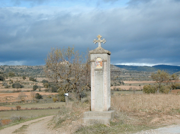 Sobre basamento de dos escalones pilar de sección cuadrangular de unos 2 m de altura sobre el que asienta, separado por una moldura, cuerpo piramidal rematado por cruz de cemento trebolada. Se halla revocado en cemento.